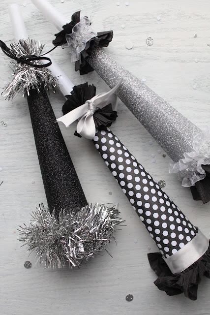 Now comes the fun...embellishing!! You can really anything to create festive party horns! For our black and white polka dot horns, we used black crepe paper. We added some hot glue around the opening of the horn and just ruffled the paper as we glues it on. Then we glued a silver satin ribbon on to hide the end of the crepe paper. At the bottom, we also created a ruffle but glued the paper in the center so it created a ruffle on the top and bottom. We tied a ribbon in the center and fluffed the paper on the top and bottom to create a fuller look! With the silver and black glittered horns we used tinsel and decorative ribbon. Hoe you will try these for your New Year's party!