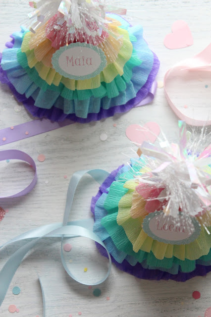{we used white for our clouds and pastel rainbow colors for the tassels}